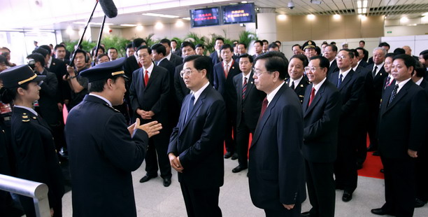 胡锦涛总书记听取校友刘胜利局长(左二)工作汇报