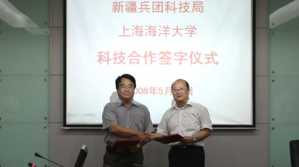 应我校邀请,新疆生产建设兵团科技局党委书记、局长田笑明,副巡视员吴继兴等一行10人来校访问,潘迎捷校长在行政楼会议室会见了访问团成员;5月21日下午,我校与新疆生产建设兵团科技合作对接会在科技大楼四楼会议室举行。黄硕琳副校长与田笑明局长代表双方签订了《新疆生产建设兵团科技局上海海洋大学科技与人才全面合作》框架协议。科技处陈文银副处长主持会议。