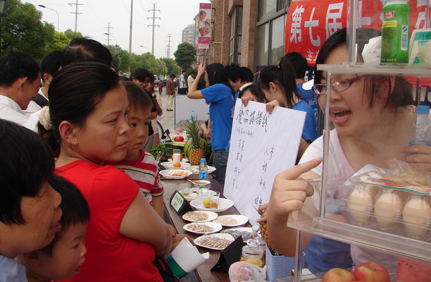 来自食品学院科学商店的志愿者在当天的活动中为居民们耐心讲解食品安全知识,食品营养小窍门,食品搭配技巧,优劣食品如何区分等。营养膳食宝塔也吸引了不少市民驻足询问。而专家咨询区更是人头攒动,大家都争着向专家咨询自己平时在食品安全与营养方面的困惑。一些细心的居民还将食品安全展板上的内容记录下来,以防遗忘;也有不少人询问我校食品科学商店的网址,希望能从网站上了解更多内容。志愿者们带去的5000份食品知识单页和手册更是被居民们争抢一空。 活动从下午3:30开始,丰富的展板知识,热情的大学生志愿者,博学的专家教授得到了金桥镇居民的一致好评,直到晚上6:00,还有很多居民围在咨询台前,热心的居民建议我校能够经常开展类似的科普宣传活动。食品学院也将继续依托科学商店为平台进行科普知识宣传,并将在暑假里开展食品安全进社区系列活动满足居民需要。