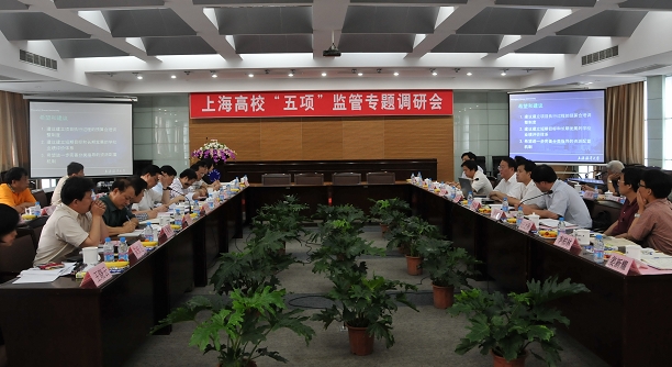 会上,潘校长代表学校对市科教党委和市教委领导到来表示欢迎,并就我校五项监管工作作了汇报。潘校长指出,高水平特色大学需要有高水平的管理,实施五项监管,加强学校管理是基本任务,实现依法治校是的重要目标,加强廉政建设是管理的核心环节,提高办学效益是重要抓手。潘校长指出,我校高度重视五项监管工作,完善制度,加强内控,科学决策,民主管理;严格制度执行,加强监管保障,学校资金处于有序可控、高效运行的状态。潘校长介绍了我校在财务管理、基建管理、科研经费管理、采购、资产经营公司等方面的基本做法、基本经验和成效,分析了存在的问题,并提出了关于加强监管工作的具体建议。吴嘉敏副书记就我校纪监审工作,封金章副校长就新校区建设、学校资产公司发展等情况作了介绍。 市科教党委市教委领导对我校五项监管工作开展给予充分肯定。阮显忠组长指出,我校在加强五项监管工作方面做到了领导重视、制度健全、党政齐抓、效果明显,规范了监管行为,提高了效益,为高校加强监管有益借鉴。吴捷副书记指出,在高校快速发展的过程中,建立惩防结合的防腐体系,加强管理,提高监管实效,是高校必须面对的问题。吴捷副书记指出,我校在推进学校发展,加强学校内部监控方面形成了一定特色,取得了一定成效,今后要作进一步探索,处理好政府政策和学校管理的关系,充分发挥现有资源效益,为推进上海高校发展提供更多经验。 座谈会上,双方还围绕科研经费管理、财务预算、纪监审工作、基建招标、校办企业改制等问题进行了讨论交流。市教委财务处处长王志伟、科技处处长王兴放、监察室主任冯惠民,市科教监察室、市教委后勤保卫处、市教委发展规划处、市教委高教处、市教委监察室、市教育企业管理中心、市教育基建管理中心有关工作人员,我校校办、组织部、纪监审办公室、科技处、财务处等部门负责人出席调研会。