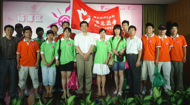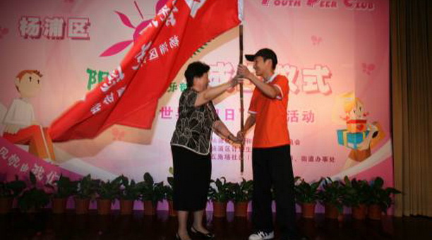 吴嘉敏副书记与志愿者合影 校党委副书记吴嘉敏、宣传部、团委、计生委和红十字会学生社团的同学参加了此次活动。我校海洋科技学院的王明同学代表辖区内7所高校青年志愿者上台发言,并作为大队长从市计生协会会长左焕琛手中接过了“杨浦阳光同伴俱乐部青年志愿者”的队旗, 围绕建设知识杨浦的总目标,结合辖区内高校集中的特点,杨浦区人口计生委、区计生协于2006年在复旦大学、同济大学、上海财经大学、上海海洋大学等7所高校,开展大学生青春健康同伴教育项目,受到大学生们的欢迎。2008年,为进一步拓展高校青春健康同伴教育的内涵,让同伴教育的活动有一个固定场所,杨浦区人口计生委、区计生协在五角场社区文化中心内创建了“杨浦区阳光同伴俱乐部”,为高校青年和社区青年搭建了学习交流的平台。通过高校青春健康同伴教育牵手与社区青年,为社区青年、学生和外来务工青年提供适宜的、易于理解和接受的生殖健康方面的培训、咨询和服务,使高校同伴教育活动向社区延伸。初步形成了政府推动、社区搭台、青少年唱戏(以青少年为主体)的工作模式。 剪彩仪式结束之后,7所高校大学生身穿“阳光同伴俱乐部”统一的志愿者服装,骑自行车环五角场中心区——万达广场宣传“阳光同伴俱乐部”,充分体现了俱乐部的阳光,健康,向上的精神。