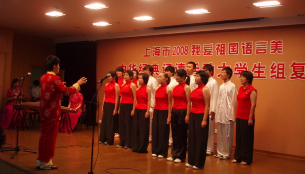 近日由上海市教育委员会、上海市语言文字工作委员会共同主办的上海市2008我爱祖国语言美中华经典诵读活动大学生组复赛在静安区青少年活动中心举行。来自本市各高校的大学生,分别参加了团体组和个人组的比赛。