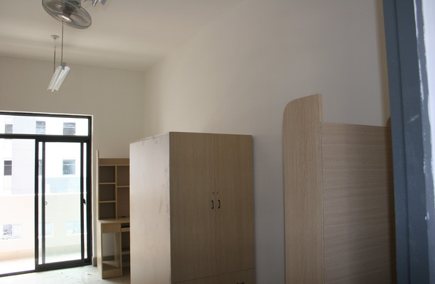 学生公寓内的电灯、吊扇等已完成部分安装,图中家具正拼装中。