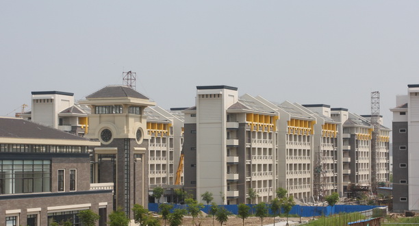 即将竣工的学生公寓简约大方,与周边的中式风格建筑相映成辉。