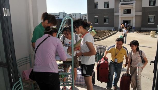 根据计划,早上8时,在龙阳路地铁站志愿者接待站的指引下,88名后续志愿者也集中分批乘坐-坐龙港快线顺利抵达新校区。9时,载运着279名志愿者的九辆班车也准时驶出军工路校区。另有146名志愿者则自行来到新校区。11时,全部志愿者顺利安全抵达新校区,大家统一领取了宿舍钥匙,以及服装、帽子、蚊香等生活、工作物品。至此,513名新校区试用及迎新志愿者全部按时到位。