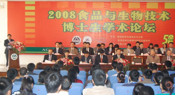 10月23-26 日,以“食品与生物技术领域内的新趋势、新起点、新发现、新超越”为主题,由国务院学位委员会办公室、教育部学位管理与研究生教育司主办,江南大学承办的“2008食品与生物技术博士生学术论坛”在江南大学举行。江苏省教育厅副厅长殷翔文,江南大学校长陈坚,党委副书记兼副校长朱拓与中科院上海植生所所长赵国屏院士等出席开幕式,食品学院党委书记陈江华与我校部分研究生同学参加了本次活动。