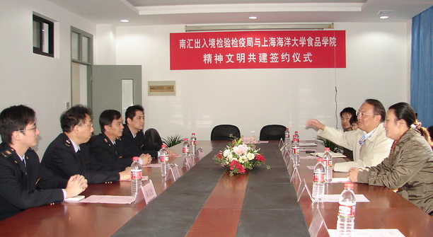 11月13日,南汇出入境检验检疫局韩世明局长一行4人来我校考察调研,参加检、院两单位精神文明共建签约仪式。潘迎捷校长出席仪式并致词,食品学院党委陈江华书记、南汇出入境检验检疫局韩世明局长分别代表两单位签约。签约仪式由学院党委副书记蔡闯主持。