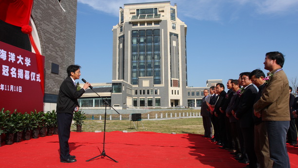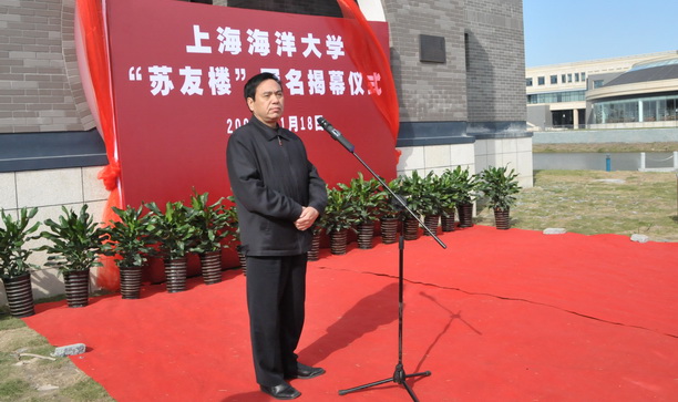 封金章副校长主持揭幕仪式。 校党委书记叶骏、校长潘迎捷、校党委副书记吴嘉敏、副校长黄硕琳和校长助理吴建农等校领导出席冠名揭幕仪式。来自各部门的主要领导,以及各学院的师生代表共同见证了这场庄严而隆重的庆典。冠名仪式由副校长封金章主持。 回眸2007年,学校95周年大庆时,我们不能忘记,海内外校友分会及校友们,发来的热情洋溢的贺信、以及沉甸甸的捐赠捐资,这既是最美好的生日祝福,也是校友对母校发展的极大关心和支持!尤其是校友联谊会江苏分会,积极联络江苏省的20余个渔业单位和众多校友,踊跃捐款50余万元。为了进一步加强母校与校友的联系,感谢和激励校友爱国荣校精神,学校决定将校园核心区域中的学生事务中心楼,予以冠名为“苏友楼”。 此次,校友联谊会江苏分会请帅国良副会长带队,出席参加“苏友楼”冠名揭幕仪式。他们分别是毕业于1970届工业捕鱼专业的帅国良学长、毕业于1982届海洋捕捞专业的张明丰学长、毕业于1980届淡水渔业专业的晁祥飞学长、毕业于1982届海洋捕捞专业的孔优佳学长等,目前分别是江苏省海洋与渔业局、江苏省水产技术推广站、滆湖渔业管理办公室的领导。 冠名仪式上,校党委书记叶骏和帅国良副会长共同为上海海洋大学“苏友楼”揭牌。帅国良副会长热情洋溢的讲话中,无不透露出在母校更名和搬迁后的自豪之情,并对广大师生表示衷心祝福,希冀在校学生要爱国荣校,继承发扬“勤朴忠实”校训精神。 来自生命学院06级的周继来同学作为学生代表发言,他认为,“苏友楼”的揭牌是“勤朴忠实”校训继承与发扬的旗帜,是海大承前启后、继往开来的里程碑,是我们顽强奋斗的精神支柱!他将融入我们的热血之中,激励着我们新一代海大人,将这神圣的历史火炬传递。海大人欢聚一堂,缅怀历史,展望未来。作为新时期的海大学子,有太多的感情需要抒发。但这些都不够,我们更应是求真务实的,我们深知,海大的未来应当由我们共同缔造。今天我们以海大为荣,明天我们以海大为傲! 潘校长发表致辞,感谢江苏校友们的慷慨义举,感谢各界人士尤其是最亲密的校友们对上海海洋大学的关心和支持。他指出,当前我校处于快速发展的关键时期,需要得到来自方方面面的支持与关心。同时,上海海洋大学的校友有着爱国荣校的光荣传统、高度的社会责任感、良好的专业素养和奉献精神。通过对苏友楼的冠名,旨在激发广大青年学子的自豪感、使命感,树“爱国荣校”之魂、立“服务母校”之根。我们美丽的上海海洋大学,成为激励学子刻苦学习、求实创新的神圣殿堂。其次,营造新的文化认同。既然我们在临港新城这片热土上,建构了这样一个辉煌的学术共同体,就一定要把她当作自己的家园。21世纪的中国发展战略、上海的地域优势,都为我们抓住这个历史机遇,提供了现实可行的条件。我们在这里隆重举行“苏友楼”冠名揭幕仪式,是要传达一个重要讯息:上海海洋大学临港校区依然是广大校友永远的精神家园,一草一木寄托着你们的关爱,欢迎各位校友常回来看看! 最后,校友代表们在副校长封金章、校办主任张敏等陪同下,饶有兴趣地参观了临港新校区新气象,忆往昔,激动不已、豪情万丈!