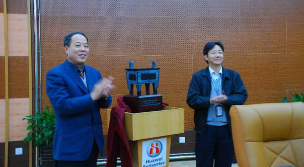 研究会理事长、复旦大学现代教育技术中心主任朱晓强教授、华为赛门铁克公司副总裁先后致辞祝贺。封金章副校长致答谢辞,感谢理事会对我校新校区信息化建设献计献策,并与朱晓强理事长共同揭开研究会的贺礼。随后,现教中心吴开军副主任介绍了我校新校区数字校园的建设情况,华为赛门铁克的技术人员就存储技术进行了专题介绍。