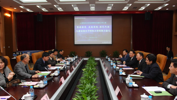 检查组听取我校学生工作负责人专题汇报。 会上,校长潘迎捷作了题为“坚持特色、发扬传统、深化内涵,为建设高水平特色大学而努力奋斗”的工作汇报,从历史沿革与基本情况、办学理念与创建思路、建设成效与经验总结、文明单位创建特色、工作不足及努力方向等五个部分作了精彩的讲解。 市教卫党委高校文明单位检查组在听取专题汇报、进行实地检查、召开师生座谈会、详细查阅资料等工作后,检查组成员一致认为,我校在2007-2008年两年的文明单位创建中,始终坚持社会主义办学方向,承袭传统和特色,把创建“一流特色大学”作为文明创建的新高点,两年中实现了更名海洋大学和搬迁临港两个历史性跨越,特别是作为一次性整体搬迁的高校,学校克服了时间紧、任务重等诸多困难,全校师生具有高度的政治意识和大局意识,为上海市高校布局调整的顺利进行做出了应有的贡献和牺牲。检查组成员一致认为,我校“人和、心齐、劲足、气顺”的和谐氛围浓厚;学校政治思想工作、人事工作、教学科研工作成效显著,辅导员队伍建设专业化、专家化措施得力、心理健康教育作为上海市示范性单位富有特色;学校极其注重校区、城区、社区、企业的联动,创新科普活动的载体、体制、机制,让社会共享了学校文明创建成果,得到社会的广泛认同。希望我校在今后的工作中,以搬迁临港新城为契机,进一步聚焦内涵建设,营造良好文化氛围,落实措施、凝聚人心,争取在文明创建的新机制上有新突破,为更好地培养海洋创新型人才作贡献。 叶骏书记对市教卫系统文明单位创建检查团到我校检查工作表示热烈的欢迎,并指出,市文明单位是两年进行一次检查评比,但我校文明单位创建工作没止境,建设文明单位是我校一直坚持的目标。 在听取检查团意见后,叶书记对检查团成员的辛勤劳动表示感谢,他指出,检查团的反馈对我校发展提出了鞭策和鼓励,学校将以创建文明单位为动力,针对检查团提出的问题,加强整改,为师生提供更加优美的学习、生活和工作环境,为创造和谐校园而不断努力。