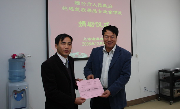 12月8日,烟台市人民政府驻上海办事处信息处张怡平处长以及山东招远益农果品专业合作社王枚生社长一行5人专程来到我校,向经济管理学院一名家庭经济困难学生捐助现金壹万元。据悉此善款是山东省烟台市人民政府在上海举行了烟台苹果品牌推介会上,该企业的一箱50年苹果树上生长的8个苹果拍买所得。企业认为向家庭贫困大学生伸出我们的援助友爱之手,帮助他们圆大学梦想,是传承中华民族的传统美德,也是体现企业的社会责任。