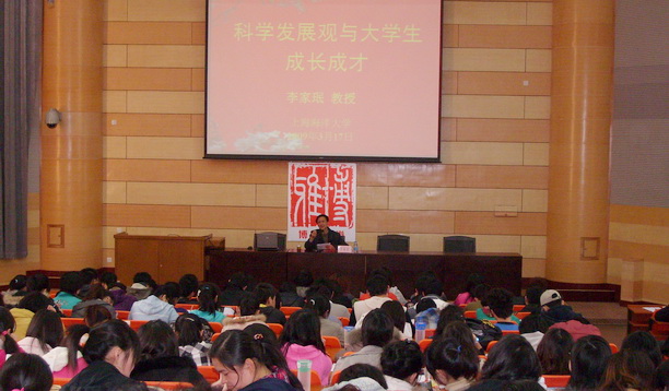 李教授在报告中主要围绕“学习实践科学发展观的意义”、“改革的成就、发展的机遇、面临的挑战”、“当代大学生成长成才之路”这三个方面的内容展开。在向广大学生简要阐述了科学发展观的产生背景及科学发展观的四大要素、五个要点之后,他带领大家回顾了我国改革开放30年来在经济水平、人民生活、高等教育、上海城市发展等各个领域的巨大变化,并强调指出了改革开放30年的变化不仅体现在物质上的巨大发展,更体现在思想上、文化上、精神上的崭新面貌。李教授以2008年北京奥运的成功举办为例,说明了我国改革开放的有效性,“鸟巢一代”的奉献精神得到了充分的展示。 在充分肯定改革开放以来取得辉煌成就的同时,他也指出了目前我国存在的城乡差距、腐败问题、居民生活保障等方面的问题仍然不容忽视,希望广大青年学生要在当前全球化、市场化、信息化、多元化的背景下,苦练内功,学好本领,以创新的精神,应对各种挑战,努力在未来的30年中造就新的辉煌。 最后,李家珉教授希望青年学生要用社会主义核心价值体系武装头脑,树立开放与大局的意识、诚信与责任的意识、合作与奉献的意识、开拓与创新的意识,并提出六个“善于”——善于学习、勤于实践、敏于思考、乐于合作、甘于奉献、勇于创新,以此与大家共勉。 李教授的报告以贴近学生的内容、幽默生动的语言、旁征博引的例证博得了在场学生的一阵阵欢笑声和热烈掌声。同学们纷纷表示,听了今天的报告,不仅感受到了祖国改革开放30年的巨大变化和成就,也充分认识到学习科学发展观、实践科学发展观的重大意义,进一步明确了自身所肩负的使命与责任。 此次讲座是市教育报刊总社主办、我校承办的博雅讲堂系列讲座之一,也是我校学生党员学习实践科学发展观活动之一。希望同学们在各项活动中有更多的收益,学好本领,修好品行,完善自我,服务人民。