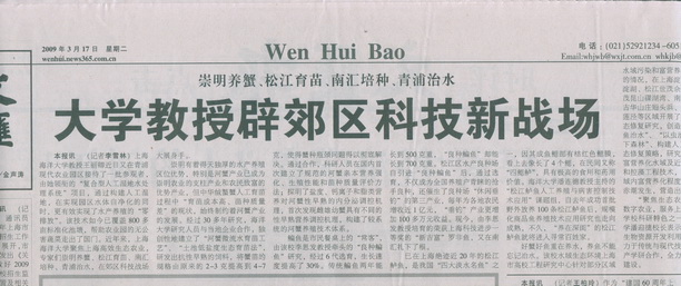 继3月10日《解放日报》报道我校水环境治理工作后。3月17日,《文汇报》在科教卫栏目以“大学教授辟校区科技新战场”为题,对我校发挥学科特色,全力服务上海新农村建设卓有成效地工作进行了通栏报道。现摘录《文汇报》报道如下。