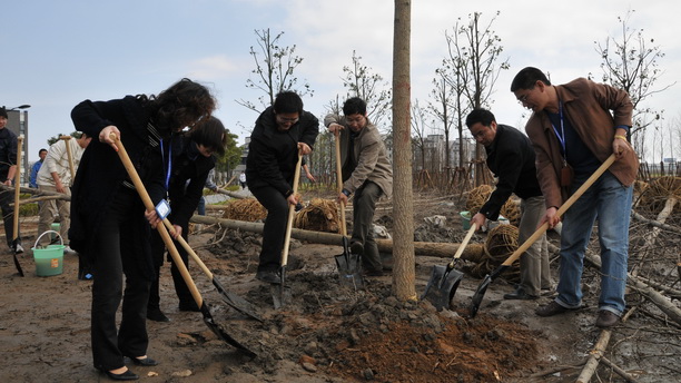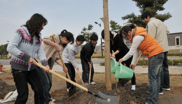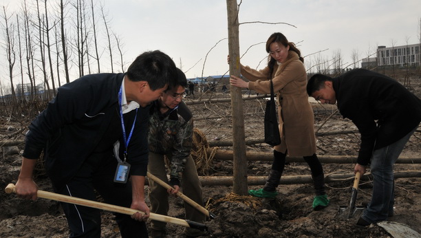 在植树现场,尽管道路还满地泥泞,在辅导员身先士卒带领下,志愿者们纷纷拿起工具,或五人一组,或六人一组,在园林公司专业人士的指导下,努力将一颗颗小树放入先前挖好的坑内。大家挥锹铲土,添肥撒水,齐心协力,植树任务很快完成。