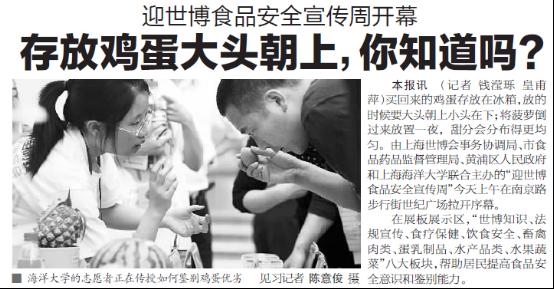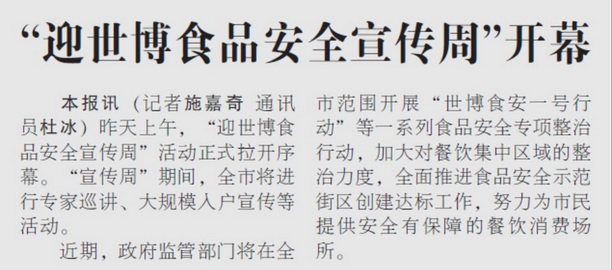 5月15日上午,由我校与上海市食品药品监督管理局、上海世博会事务协调局、黄浦区人民政府联合主办,上海市食品学会、食品药品监督管理局黄浦分局、上海奶业行业协会、上海水产学会等单位共同协办的以“构筑食品安全防线,喜迎精彩世博盛会”为主题的“迎世博·食品安全宣传周”在南京东路世纪广场正式启动。