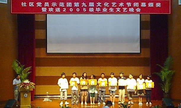 6月18日晚,党员示范团第九届社区文化节闭幕颁奖暨欢送05级毕业生文艺晚会在图文中心104报告厅举行。学生处处长李兴华、后勤服务中心直属党支部书记戴永金、人文学院党委副书记高晓波、外语学院党委副书记戴辉明出席并为获奖集体与个人颁奖。学院团委书记、党员示范团全体辅导员、社区员工以及获奖学生、毕业生代表共400余人观看了演出。颁奖仪式由社区党员师范团团长任和平主持。