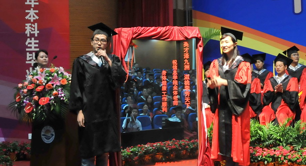 学生代表向学院赠送毕业纪念品 气势磅礴的国歌后, 院长黄冬梅教授言简意赅、语重心长的致辞拉开了毕业典礼的序幕。二百多名毕业生身穿学士服,依次从校领导和院学位委员会教授中接过他们大学生涯的硕果——学位证书和毕业证书,各个脸上洋溢着收获的笑容,因为大家都知道在证书的背后收录着他们大学生涯的喜怒哀乐、点点滴滴,那是值得一生去珍藏的美好回忆。随后信息学院黄院长、院党委施书记为校优秀毕业生代表颁发了荣誉证书,10位市优秀毕业生代表也受到了校党委副书记副校长黄晞建教授、副校长黄硕林教授、校长助理吴建农教授的隆重表彰。 作为毕业典礼的主角,毕业生代表宋倩倩发言中,不仅回顾了同学们在学海路和临港的学习生活经历,表达了对母校和学院的留恋,及对各位“传道、授业、解惑”的教师和默默耕耘,无私奉献的家长们的衷心感谢,并表示在海大的收获是丰厚的,作为一段人生旅途的终点和另一段旅途的起点,他们将继续坚持真理,续写自己人生的壮丽篇章。为了表达同学们对母校、对学院的感恩,同学们还挑选了一个“师表镜”赠送给学院,“育英才泽九洲,滋桃李芳天下”,祝愿信息学院的明天有如明镜一样的清澈明亮。信息与计算科学系主任张建新老师如亲人般的发言中,无论是对同学们顺利毕业的“祝贺”、还是对悉心培育他们成才的家长的“恭喜”,亦或是对即将走向社会同学们的“叮咛”和“提醒”,句句肺腑,字字深情,更加深了同学们与老师的不舍之情。 校党委书记叶骏教授的讲话再次将毕业典礼推向了高潮,叶书记代表学校党政领导和全体师生员工向信息学院2009届本科毕业生同学表示最热烈的祝贺,祝贺同学们通过勤奋学习和顽强拼搏,圆满完成了大学学业;祝贺同学们转入新的起点,开始人生新的征程!同时也向一直以来含辛茹苦、孜孜教诲的家长们以及悉心指导,培养学生的老师们致以衷心的感谢。他希望同学们坚定理想信念、珍惜眼前、把握机会、脚踏实地,艰苦奋斗,秉承“勤朴忠实”的校训精神,衷心祝愿广大毕业生一路顺风,前程似锦,幸福平安。 最后,毕业生代表向校领导、老师们献上了自己诚挚的祝福,一枝枝鲜花表达了同学对母校的美好祝福,一张张贺卡表达了同学对老师的深情感谢!“铭记母校校训,谨遵师长教诲,弘扬海大精神,报效祖国人民。”信息学院2009届全体毕业生正是在这雄壮的毕业宣誓中将毕业典礼划上了圆满的句号,将他们的大学生涯划上了圆满的句号。 “十年寒窗苦,今朝凌云志”,我们相信,你们的明天会更好;“饮其流者怀其源,学有成时念吾师”,无论何时何地,希望同学们都能心系母校,有空常回来看看。