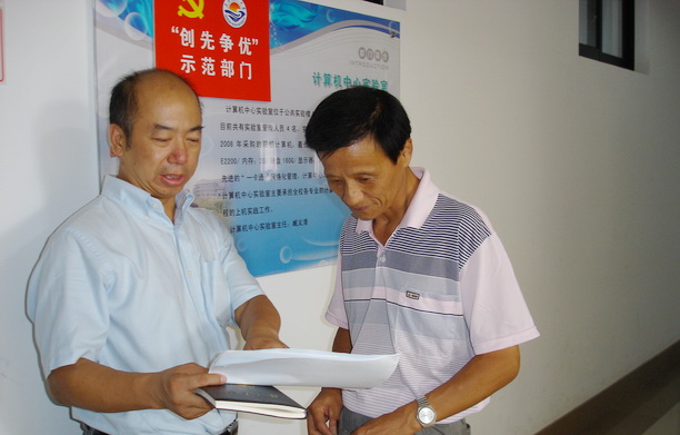 公共计算机实验室两位党员教师在商量工作