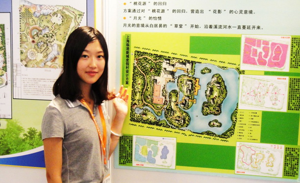 金奖获得者董悦同学展示其获奖作品 上海设计双年展由上海市科委支持主办,该展会已经连续举办了5期,70%的参展单位是外国设计公司,展会期间设有国际设计专题研讨会,举办上海设计双年展大学生景观设计大奖赛。大奖赛由建筑、景观、园林设计、室内、规划、环艺等相关专业院校的学生参加,东华大学、复旦大学、上海海洋大学、上海大学、上海第二工业大学、上海商学院、上海应用技术学院等十几所高校参加了此次大赛。本次竞赛普通高等学校本科及其以上组各奖项设置分别为:金奖1名、银奖3名、铜奖5名、优秀奖若干名。我校学生在此次竞赛中突出重围,设计作品包揽金银二奖,充分体现了我校园林专业水域生态景观的特色与优势,评委团队对我校学生作品给予了充分的肯定和高度的评价。