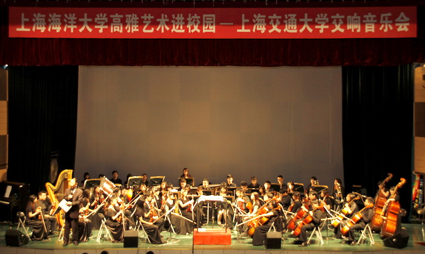 担任本场音乐会的指挥是该团队中最年轻的成员,但他有着丰富的演出经历,在他专注投入的指挥下,交大交响乐团先后为大家献上了卡门组曲、C小调交响曲《命运》选段、经典名曲《梁山伯与祝英台》选段以及为迎接建党九十周年而特意准备的《红色娘子军》组曲等耳熟能详的曲目。 在指挥家时而气势如虹,时而细致入微的引领下,整场音乐会高潮迭起,节奏强烈时热情似火、气势磅礴;乐声流畅处细腻婉约、丝丝入扣,在场的同学们无不沉醉于交响乐的独特魅力中。此外一名交大学子还在身后乐团的配合下登台献唱了《歌颂祖国》,浑厚的嗓音伴随悠扬的交响,博得台下阵阵掌声。 五首曲目演毕,在我校同学们持续不断的掌声中,指挥再度返场,盛情难却加演一曲并与台下同学交流互动,整场音乐会在融洽地氛围和热情的掌声中圆满落幕。此次交大交响乐团高雅艺术之行,不仅为海大学子带来了一场听觉盛宴,在艺术上进行了交流,更是促进了两校之间的友谊,为日后两校间的交流打下了坚实的基础!