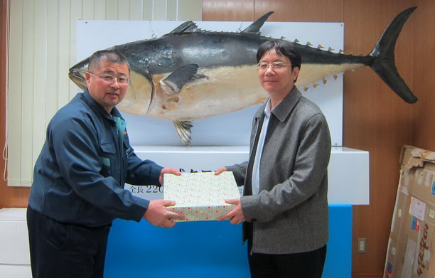 研究所中谷正宏研究员详细介绍了水产研究所的发展,特别是蓝鳍金枪鱼全人工养殖的历史,在2002年研究成功蓝鳍金枪鱼全人工养殖的基础上,于2007年成功地人工孵化生产出第2代的稚鱼,其后又从第2代亲鱼的产卵中成功地人工孵化生产出第3代稚鱼。2009年10月成功地生产出全人工养殖蓝鳍金枪鱼第3代的幼鱼共40,000尾,并将其中的30, 000尾上市销售给养殖户,首次实现了批量的生产化,并向产业化生产迈出了很大的一步。