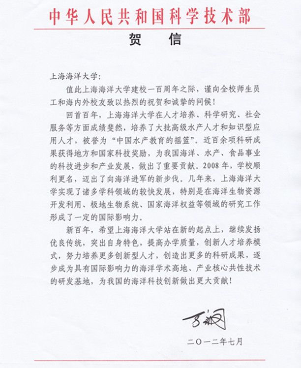 在上海海洋大学喜迎100周年校庆之际,全国政协副主席、科学技术部部长万钢致信我校,代表科技部向全校师生员工和海内外校友致以热烈的祝贺和诚挚的问候。