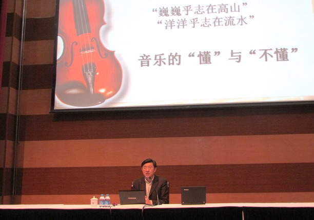 2013年5月7日下午,第七届“读书•文化”节第三场海韵讲座在图文104举行。本次讲座邀请了上海音乐学院副教授、著名音乐主持人王勇博士来海大作“弦动我心”为主题的音乐讲座。