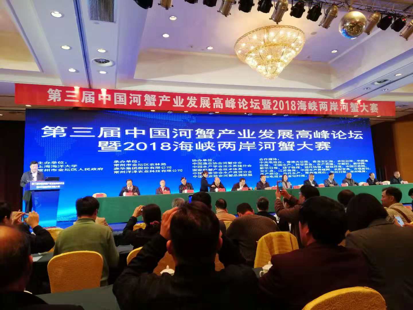 11月15日,第三届中国河蟹产业发展高峰论坛暨2018海峡两岸河蟹大赛在常州举行。本次论坛由上海海洋大学和常州市金坛区人民政府共同主办,常州市金坛区农林局、澳华集团和常州洋泽农业科技有限公司承办,中国渔业协会河蟹分会、中国水产学会淡水养殖分会、国家虾蟹产业技术体系、中国渔业协会河蟹品牌联盟协办。来自全国各地相关高校、科研院所、政府、技术推广机构、河蟹协会以及企业近300人,共聚高峰论坛,共话河蟹产业未来发展路径。