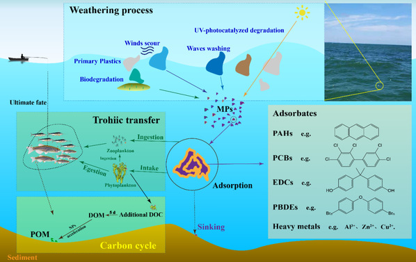 水域和海洋环境中微塑料由于其难降解性,发生长时间迁移过程,受到多种物理、化学或生物作用,发生风化作用,微塑料风化后在环境介质中极易与多种污染物结合,被海洋生物吞食,通过食物链进入人体,造成潜在的健康威胁。于飞研究团队长期从事多环境介质微塑料的赋存特征、微塑料表界面行为研究以及微塑料污染控制技术研究,受邀针对微塑料与水环境中有机污染物和重金属的富集行为、作用机制和发展趋势进行综述,系统总结了环境因素对微塑料的物化性质影响和微/纳米塑料与重金属、有机污染物之间的富集行为机理。上述论文的发表为深入研究复杂环境中新兴污染物的长距离迁移与归趋等环境行为提供重要科学依据,为海洋微塑料污染的有效预防和控制奠定了研究基础。