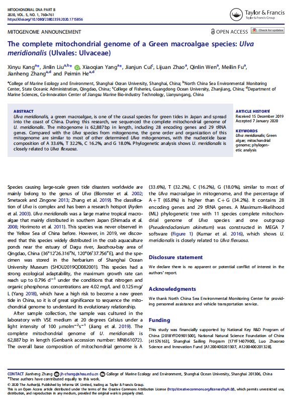 《一种大型石莼属绿藻Ulva meridionalis的全线粒体基因组分析》在《Mitochondrial DNA Part B》上发表