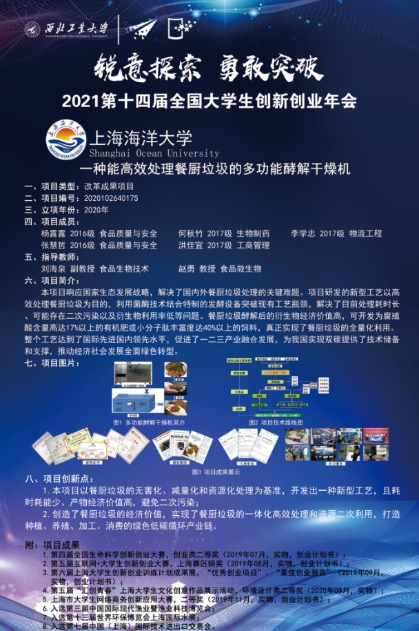 由教师刘海泉、赵勇指导,学生杨露露负责的创新训练项目《一种能高效处理餐厨垃圾的多功能酵解干燥机》经在线展示、投票,荣获年会“我最喜爱的项目”奖,这是学校连续两年获此奖项。由教师张建恒指导,学生杨晓倩负责的报告论文《一种大型石莼属绿藻Ulva meridionalis的全线粒体基因组分析》在年会上作在线交流。