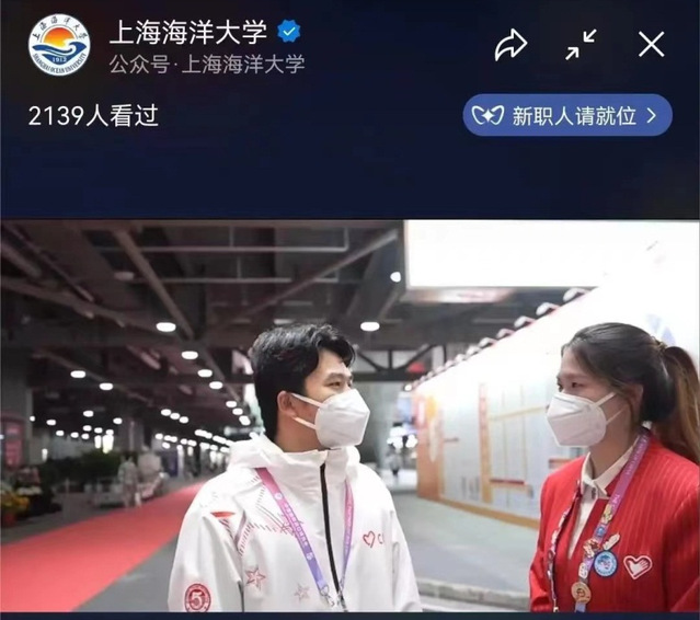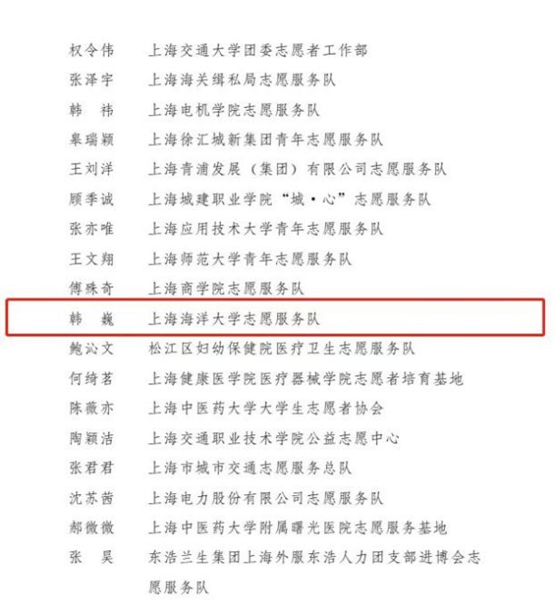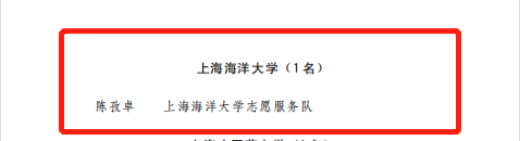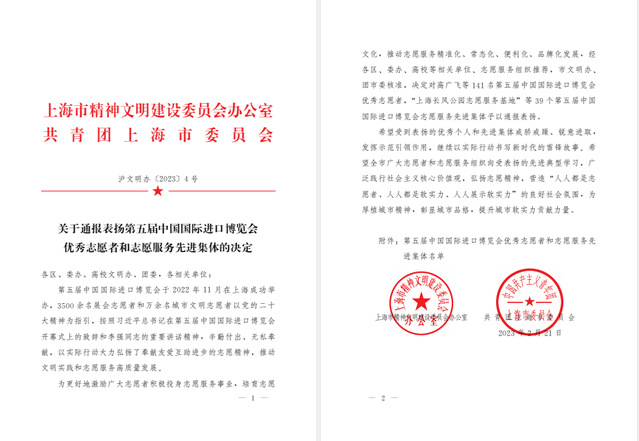 近日,上海市精神文明建设委员会办公室和共青团上海市委员会联合下发《关于通报表扬第五届中国国际进口博览会优秀志愿者和志愿服务先进集体的决定》,上海海洋大学外国语学院2020级翻译硕士班韩巍、海洋文化与法律学院2021级渔业环境保护与治理专业研究生陈孜卓荣获“第五届中国国际进口博览会优秀志愿者”称号。