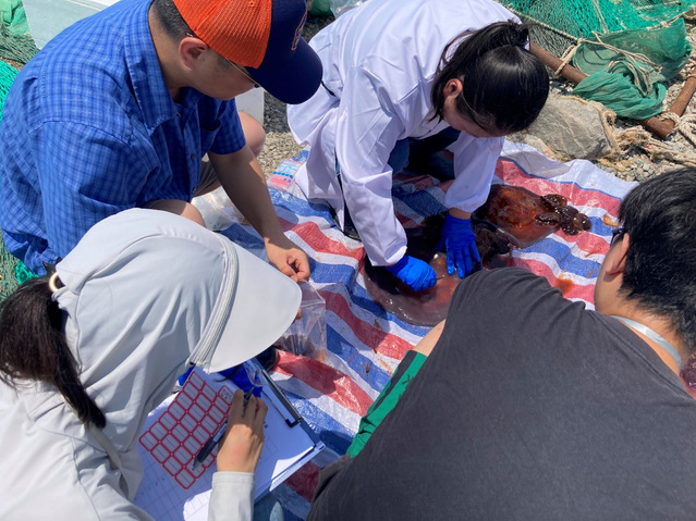 7月11日下午,师生冒着高温酷暑在中港码头进行海蜇采样及生物学测量