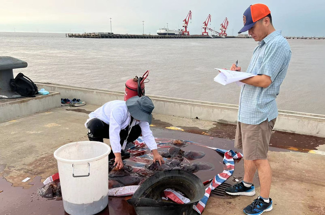 7月10日下午,渔船首次靠港,工作人员开展海蜇上岸渔获统计