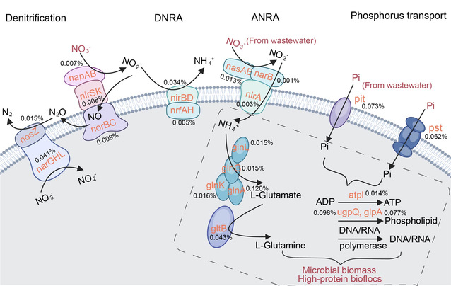 生物絮团技术通过形成悬浮微生物絮团实现较高密度封闭式生产,近年来受到国内外普遍关注。课题组在前期研究中发现,在充分补充有机碳源时,生物絮团养殖水体中不会出现硝酸盐和磷酸盐的明显积累。通过VSS/TSS指数、DAPI聚磷染色等方法,课题组发现生物絮团可通过异养同化过程高效同步去除磷酸盐;应用宏基因组学分析了氮磷转化相关基因,证明了生物絮团中硝酸盐可通过好氧反硝化、异养同化、异化还原为铵等路径被去除,磷酸盐转运主要依靠磷酸盐特异性转运系统完成。而且,处理后形成的生物絮团粗蛋白含量高于40%,必需氨基酸指数超过0.9,具备较好的饲源化利用潜力。