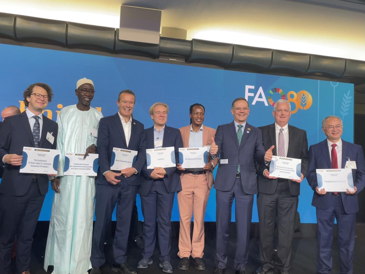 10月15日,倪卫杰代表学校现场领取“可持续水产食品体系”奖项。该奖项共评选出46家优秀机构,重点表彰其在渔业可持续发展与FAO“蓝色转型”中的突出贡献。上海海洋大学作为46家机构中仅有的3所高校之一,与中国水产科学研究院淡水渔业研究中心、珠江水产研究所共同代表中国入选,凸显了中国在全球水产可持续发展领域的核心地位。