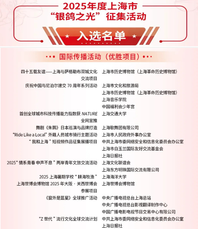 2月26日,2025年度上海市“中华文化国际传播”和“银鸽之光” 第二十届上海市国际传播优秀项目征集活动结果揭晓,上海海洋大学的国际暑期学校项目——耕海牧渔成功入选,获评上海市银鸽之光国际传播活动优胜项目,彰显了上海教育国际传播的坚实成效与学校一流学科赋能中华文化国际传播的高校力量。
