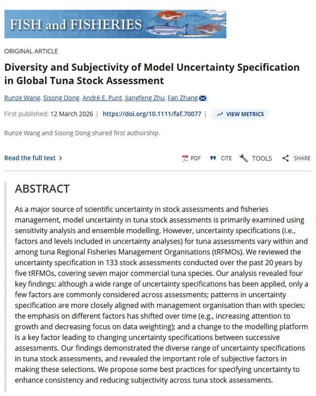 近日,上海海洋大学张帆教授课题组和远洋渔业国际履约团队联合美国华盛顿大学等团队,在全球金枪鱼资源评估中模型不确定性研究方面取得新进展。相关成果以《Diversity and Subjectivity of Model Uncertainty Specification in Global Tuna Stock Assessment》为题发表在渔业领域顶级期刊《Fish and Fisheries》。上海海洋大学2024级硕士研究生王润泽和董思宋博士后为论文的共同第一作者,张帆教授为通讯作者。该研究得到了国家自然科学基金项目(32373132)和全球重要鱼种监测项目的支持,并依托上海海洋大学水产学科“双一流”建设以及国家远洋渔业工程技术研究中心等科研平台提供的保障。