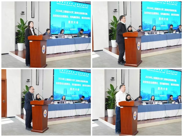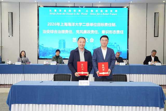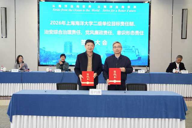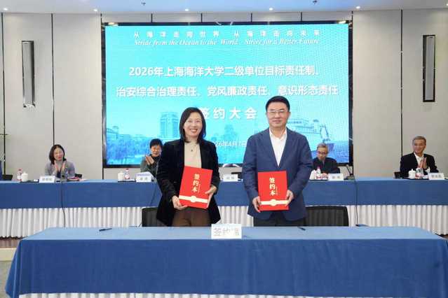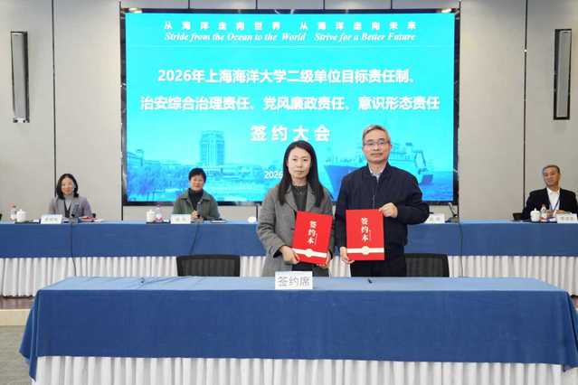 4月7日下午,上海海洋大学2026年二级单位目标责任制、治安综合治理责任、党风廉政责任、意识形态责任签约大会在海洋科技大学109会议室举行。全体在校校领导和中层干部出席会议。会议由校党委副书记潘燕主持。