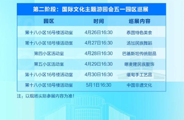 值得一提的是,4月26日至5月1日,国际文化主题游园会将走进各学生园区,开展五一巡展活动。泰国特色美食、汤加民族舞蹈、巴基斯坦传统甜品、喀麦隆民族服饰、缅甸手工艺品以及中国非遗文化将陆续与师生见面,让大家在生活园区内即可体验世界多元文化。
